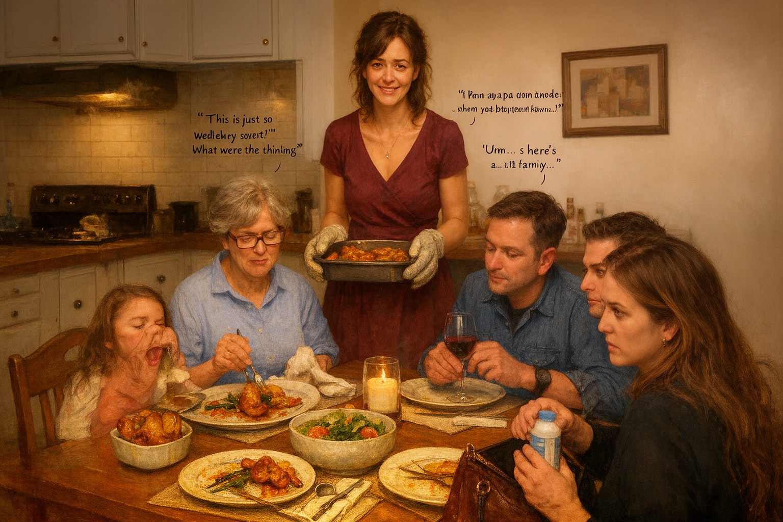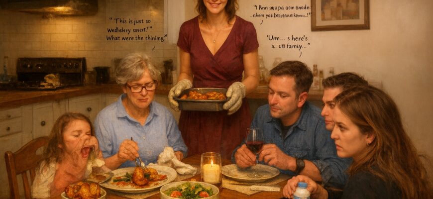 Veronika byla poslední dva dny téměř bez spánku. Pobíhala mezi kuchyní, tržnicí a troubou, aby všechno stihla. Teď stála u čela stolu s horkou mísou v rukou, vzduch byl prosycený vůní česneku a rozmarýnu, a její úsměv tuhnul jako porcelánová maska.
