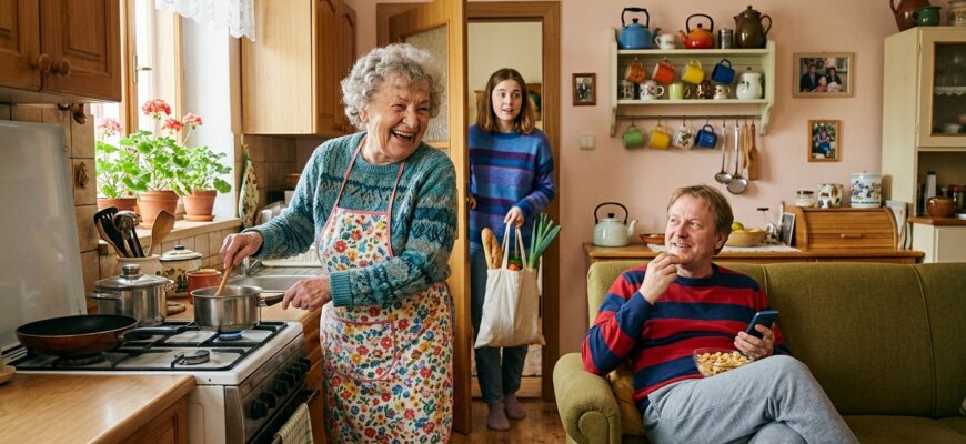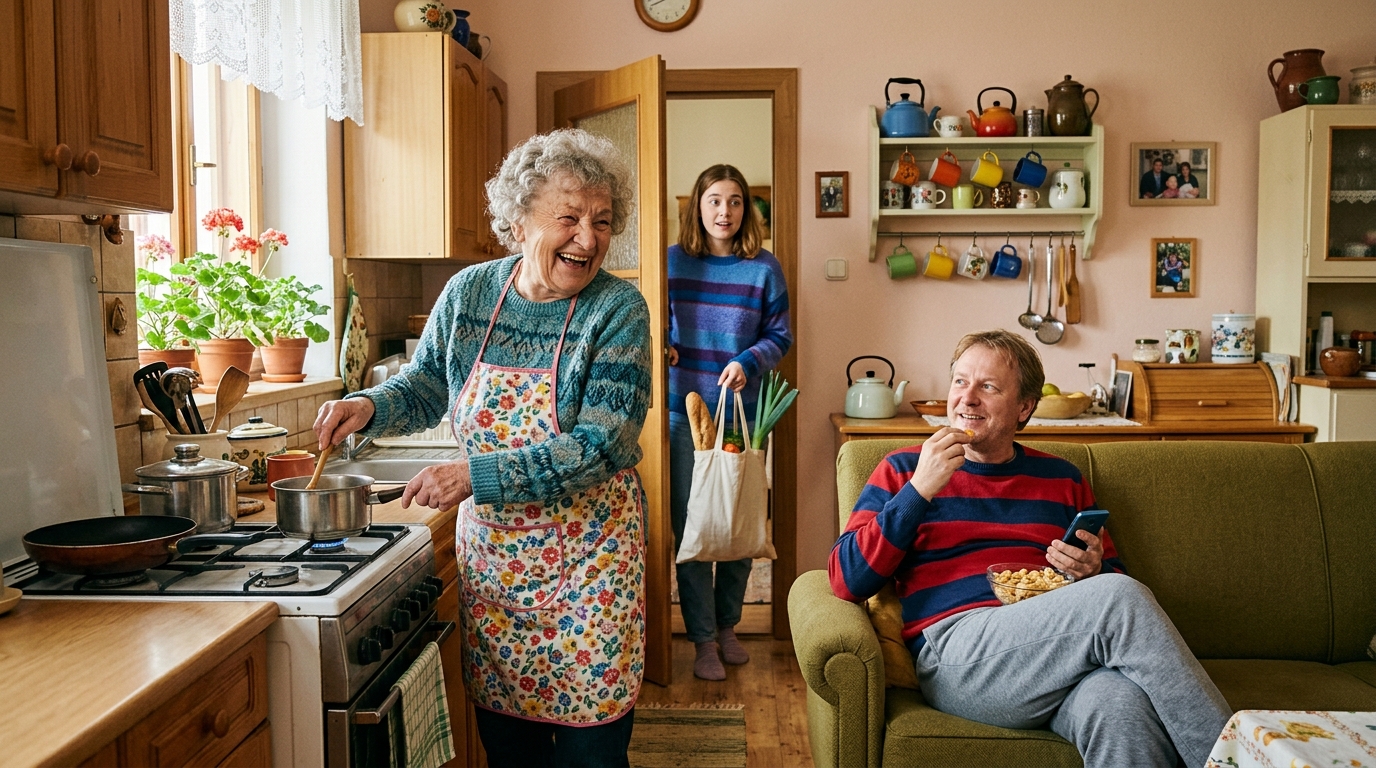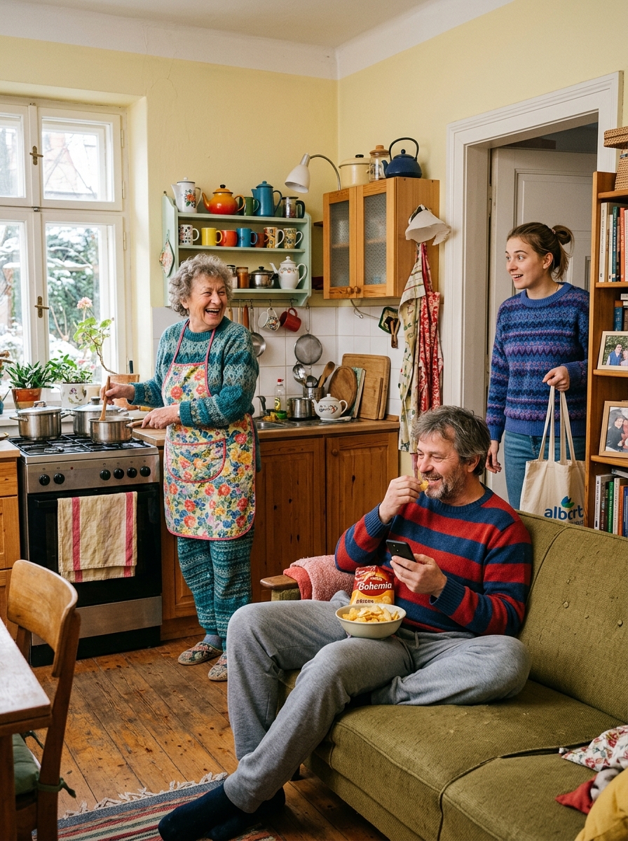 Starý gauč zasténal pod tíhou těla. Jan Řezník ani neotočil hlavu od sportovního kanálu. Bez zájmu si nasypal do úst další hrst slaných krekrů a drobky si nechal padat na domácí kalhoty. Zato Helena Švecová se okamžitě otočila od sporáku. Mastné ruce si utřela do vyšisované zástěry.